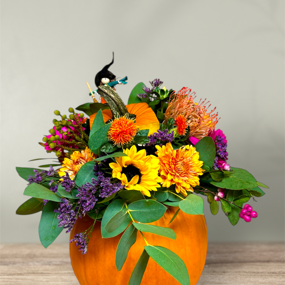 Bring the warmth and colour of autumn into your home with our stunning pumpkin arrangement. Each one is hand-crafted using a mix of rich seasonal blooms and lush foliage, beautifully arranged inside a real pumpkin for a striking seasonal display. Perfect as a table centrepiece or gift, it captures the essence of harvest season in every detail. Choose between small or large pumpkin size